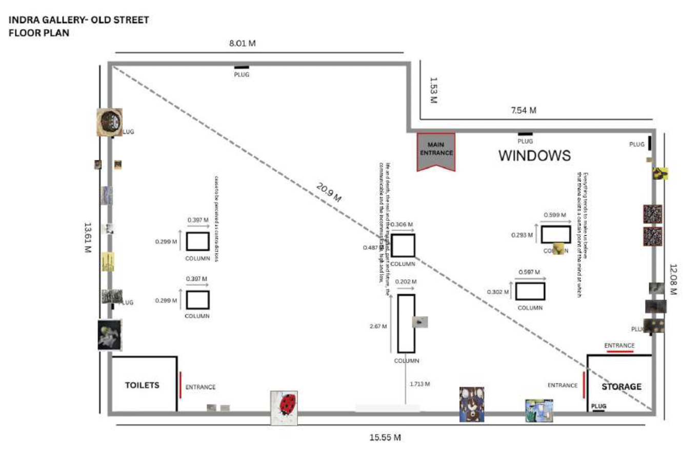 My responsibility within this collaboration was the selection of the contemporary artists. This is never a process of filling a scheme or searching for works that simply illustrate a curatorial thesis. It requires the ability to listen to the work, to the artists, to what each practice is genuinely doing and what it truly needs in order to be seen clearly. The curatorial concept developed by Michaëla was built around the idea of contradiction as a productive condition. Not opposites in irreconcilable conflict, but opposites held within a single field, where the tension between them becomes the space of meaning. The intellectual frame referenced an idea by André Breton that there exists a certain point of the mind at which life and death, the real and the imagined, cease to be perceived as contradictions. Michaëla placed this phrase on the columns of the gallery, repeating it throughout the space as both atmosphere and structural proposition. The way the phrase was formatted spread across the surfaces of the columns, creating an effect reminiscent of Futurist visual poetry, which turned out to be very much in rhythm with the placement of the works on the walls.